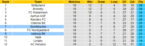 Hàng công của Aalborg và Sonderjyske đều không hoạt động thực sự hiệu quả ở mùa giải này. Sau 19 trận, Sonderjyske ghi 27 bàn, trong khi đó con số tương tự của Aalborg là 21 pha lập công. 2 trận đối đầu gần đây trên sân của Aalborg khép lại với chỉ tối đa 2 bàn/trận.