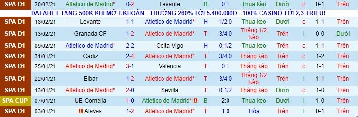+ Thống kê 10 trận gần nhất của Atletico Madrid