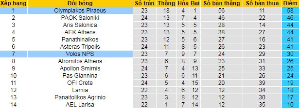 + Bảng xếp hạng VĐQG Hy Lạp
