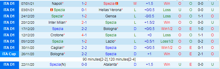 + Thống kê 10 trận gần nhất của Spezia