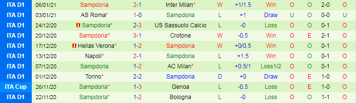 + Thống kê 10 trận gần nhất của Sampdoria