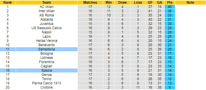 Quay lại với trận đấu muộn nhất vòng 17, thầy trò HLV Italiano trở về sân nhà để tiếp đón Sampdoria. Khách quan, Spezia có được đà tâm lý hứng khởi sau trận đấu với Napoli song từng đó là chưa đủ để giới mộ điệu gửi trọn niềm tin cho đội chủ sân Alberto Picco.