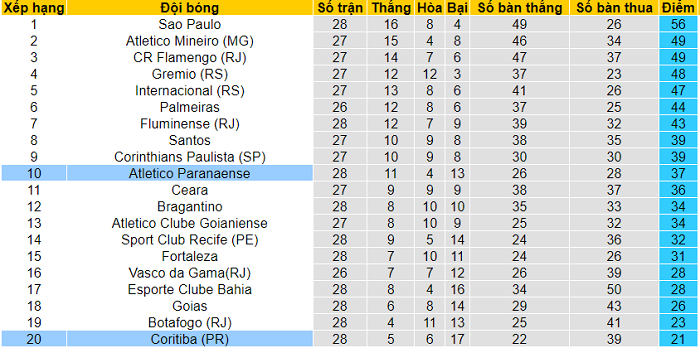 Bảng xếp hạng giải VĐQG Brazil mới nhất