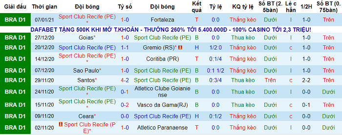 - Thống kê 10 trận gần nhất của Sport Recife