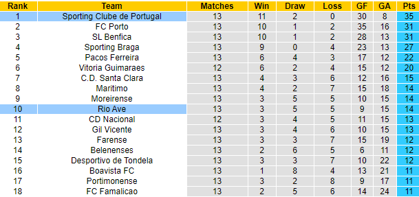 Lần tái đấu sắp tới Sporting Lisbon cũng đang phải nhận những cảnh báo vào khả năng mất điểm. Rio Ave đang chỉ xếp thứ 10 trên bảng xếp hạng giải VĐQG Bồ Đào Nha với 14 điểm sau 13 trận nhưng đã cho thấy được sự hồi sinh bằng thắng lợi 3-0 trước Portimonense ở vòng đấu gần nhất.