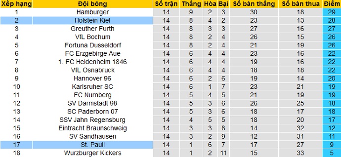 Sau 14 vòng đấu tại giải hạng nhì Đức, St. Pauli và Holstein Kiel đang ở hai thái cực hoàn toàn trái ngược nhau. Trong khi Holstein Kiel đứng thứ nhì trên bảng xếp hạng với 28 điểm thì St. Pauli cũng đứng thứ hai nhưng từ dưới lên và mới chỉ có được 9 điểm.