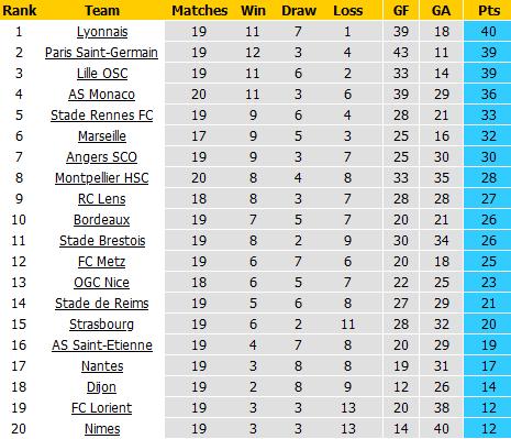 BẢNG XẾP HẠNG VĐQG Pháp