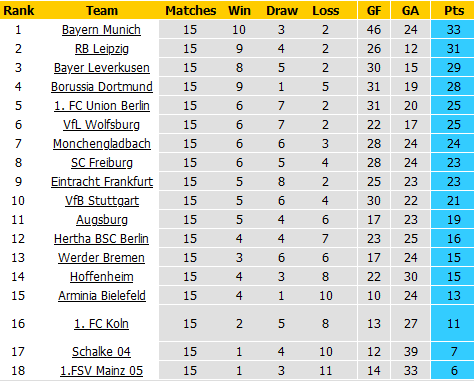 BẢNG XẾP HẠNG VĐQG Đức