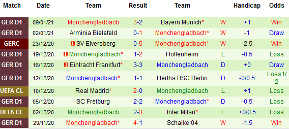 + Thống kê 10 trận gần nhất của M’gladbach