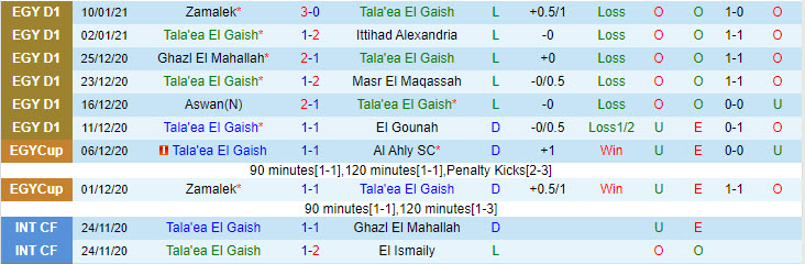 + Thống kê 10 trận gần nhất của Tala'ea Al Jaish Cairo