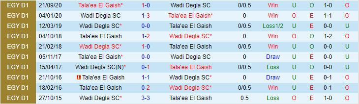Đây là kịch bản dễ xảy ra khi đối thủ của họ là cái tên cứng đầu Wadi Degla. Sau 6 lượt trận, Wadi Degla thắng 1, hoà 3 và nhận 2 thất bại. Điểm đáng nói, họ không thua cả 3 trận sân khách đã đá ở mùa giải năm nay. Trước đội chủ nhà đang khủng hoảng như Tala'ea Al Jaish Cairo, các cầu thủ Wadi Degla tự tin sẽ giành trọn 3 điểm.