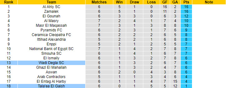 Cần biết, đội quân của HLV Ehab Galal đã nhận thất bại cả 5 lượt sau đó của giải VĐQG Ai Cập. Với chỉ 1 điểm có được, Tala'ea Al Jaish Cairo xứng đáng xếp ở vị trí cuối cùng trên bảng tổng sắp và là ứng viên sáng giá cho một suất xuống chơi tại giải hạng 2 Ai Cập mùa tới.