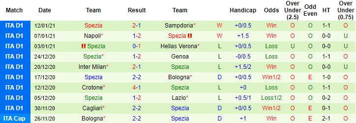 + Thống kê 10 trận gần nhất của Spezia