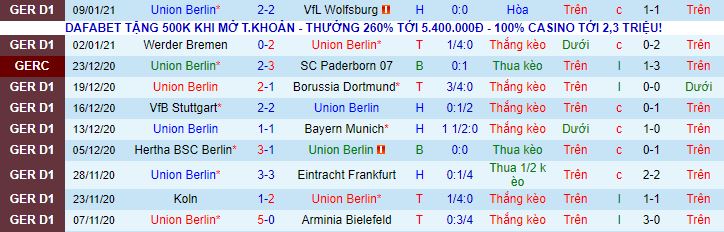 + Thống kê 10 trận gần nhất của Union Berlin