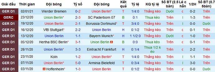 + Thống kê 10 trận gần nhất của Union Berlin