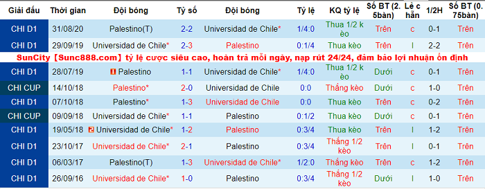 Với lợi thế sân nhà, Univ de Chile có phần được đánh giá cao hơn trước giờ bóng lăn. Nhưng do hai đội nhiều khả năng chia điểm nên lựa chọn Palestino sẽ mang lại lợi nhuận cho giới đầu tư.