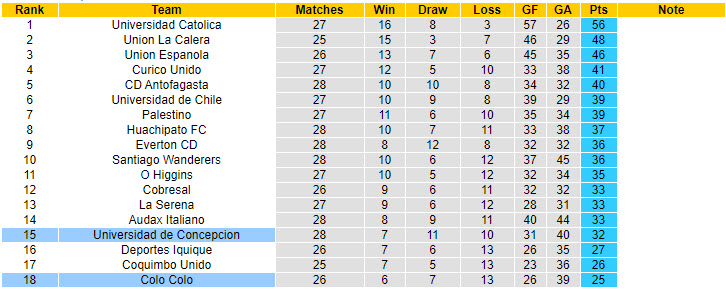 Colo Colo đang đứng trong tình thế nguy hiểm khi đứng ở vị trí thứ 16 trên BXH giải VĐQG Chile. Cụ thể, họ có được 28 điểm sau 27 trận đã đá. Lúc này, họ chỉ còn hơn nhóm cầm đèn đỏ đúng 1 điểm. Thực tế, Colo Colo không còn nắm quyền tự quyết trong cuộc đua trụ hạng bởi họ thi đấu nhiều hơn 2 đội cuối bảng lần lượt 1 và 2 trận.