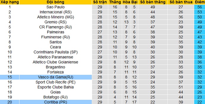 Bảng xếp hạng giải VĐQG Brazil trước vòng 30