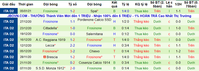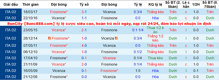 Frosinone là một trong những đội có tỷ lệ thắng kèo trên sân khách cao nhất Serie B mùa này. Tỷ lệ thắng kèo trên sân khách của họ lên tới 71.43% (thắng 5, thua 2), chỉ sau Empoli (87.50%). Trong khi đó, tỷ lệ thắng kèo trên sân nhà của Vicenza chỉ đạt 14.29%: thắng 1, thua 6.
