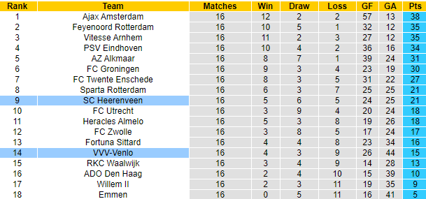 Trên bảng xếp hạng giải VĐQG Hà Lan lúc này, Heerenveen xếp ở vị trí thứ 9 với 21 điểm sau 16 trận. Trong khi đó Venlo mới giành được 15 điểm sau 16 trận, xếp thứ 14. Vì vậy ở trận đấu sắp tới, Heerenveen hoàn toàn xứng đáng được đánh giá cao hơn đối thủ trước giờ bóng lăn.