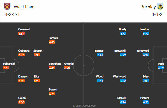 Burnley là một trong những đối thủ mà West Ham không muốn gặp tại giải Ngoại hạng Anh. 3 lần chạm trán Burnley gần đây, đội bóng có biệt danh Búa tạ toàn thua, thủng lưới 6 lần mà không ghi nổi 1 bàn danh dự. Xa hơn, 6 lần chạm trán Bunley trước đó, West Ham mất điểm 5 lần với 1 trận hòa và 4 thất bại.