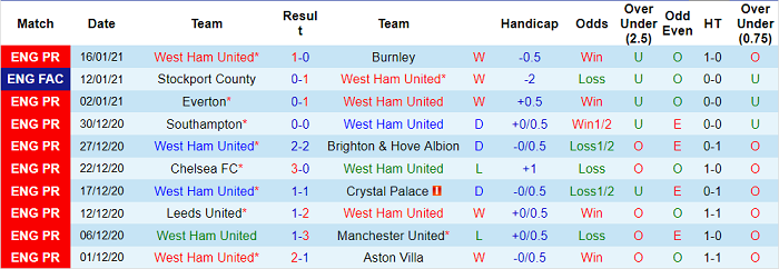 - Thống kê 10 trận gần nhất của West Ham