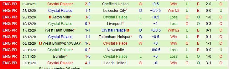 + Thống kê 10 trận gần nhất của Crystal Palace