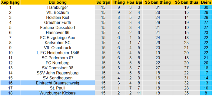 Chẳng thế mà Wurzburger và E. Braunschweig đều không có được thành tích tốt. Wurzburger chỉ thu về 8 điểm sau 15 vòng đấu đầu tiên: thắng 2, hòa 2 nhưng thua tới 11 trận. E. Braunschweig tuy khá hơn nhưng cũng chỉ sở hữu 13 điểm trong cùng khoảng thời gian.