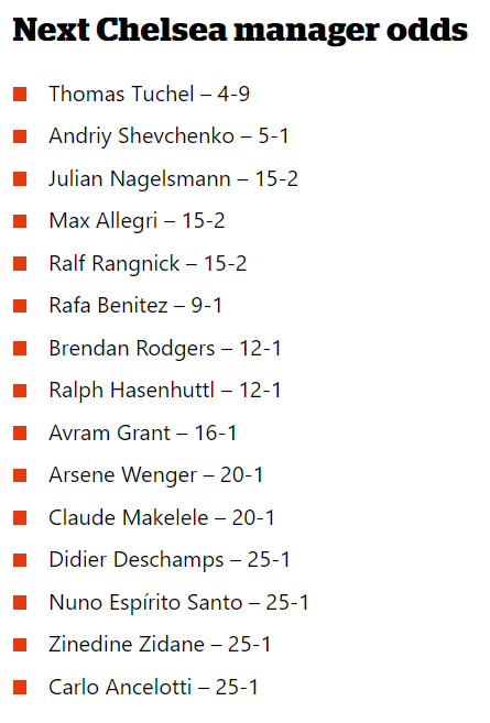 Thông tin về các ứng viên thay Frank Lampard dẫn dắt Chelsea được truyền thông và các nhà cái liệt kê từ trước khi Super Frankie bị sa thải. Sau khi The Blues chấm dứt hợp đồng trước thời hạn với cựu danh thủ 42 tuổi, mọi thứ càng được dịp để ‘nở rộ’.