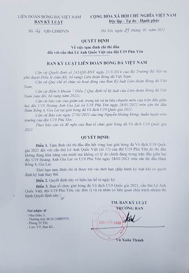 Trưởng ban kỷ luật VFF Vũ Xuân Thành ký quyết định treo giò Lê Anh Quốc Việt đến hết vòng loại U19 quốc gia 2021. Ông Thành cho biết, quyết định kỷ luật được căn cứ vào các báo cáo chuyên môn của giám sát trận đấu và BTC giải, ban kỷ luật mổ băng xem xét một cách kỹ càng.