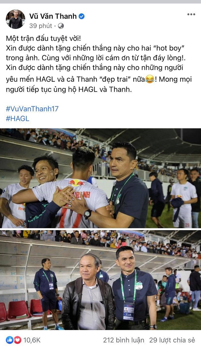 "Một trận đấu tuyệt vời! Xin được dành tặng chiến thắng này cho hai “hot boy” trong ảnh. Cùng với những lời cám ơn từ tận đáy lòng! Xin được dành tặng chiến thắng này cho những người yêu mến HAGL và cả Thanh "đẹp trai" nữa! Mong mọi người tiếp tục ủng hộ HAGL và Thanh", cầu thủ số 17 viết kèm bức ảnh bầu Đức và HLV Kiatisak.