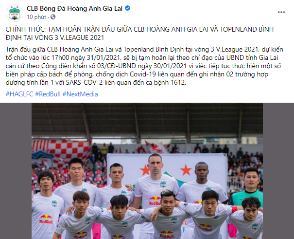 "Trận đấu giữa CLB Hoàng Anh Gia Lai và Topenland Bình Định tại vòng 3 V.League 2021, dự kiến tổ chức vào lúc 17h00 ngày 31/01/2021, sẽ bị tạm hoãn lại theo chỉ đạo của UBND tỉnh Gia Lai căn cứ theo Công điện khẩn số 03/CĐ-UBND ngày 30/01/2021 vì việc tiếp tục thực hiện một số biện pháp cấp bách để phòng, chống dịch Covid-19 liên quan đến ghi nhận 02 trường hợp dương tính lần 1 với SARS-COV-2 liên quan đến ca bệnh 1612".
