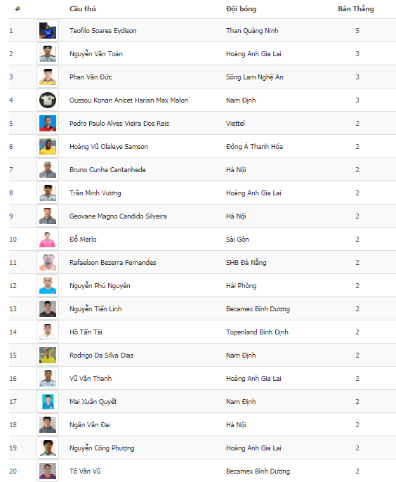 Cụ thể, Văn Toàn có 3 bàn thắng, Văn Thanh, Công Phượng và Minh Vương cùng có 2 pha lập công. Cùng Văn Toàn, hai cầu thủ khác đã có 3 pha lập công ở V-League mùa này là Phan Văn Đức (SLNA) và Konan Oussou (Nam Định).