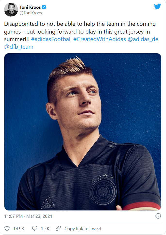 Toni Kroos khiến Real Madrid có lý do để lo lắng khi vấn đề về dây chằng trong đợt tập trung tháng 3/2021 của đội tuyển Đức.