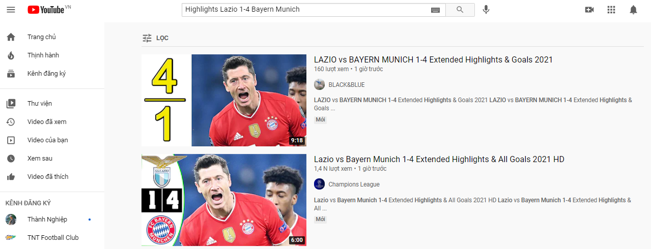 Bước 2: Tìm kiếm cụm từ khoá "Highlights Lazio 1-4 Bayern Munich"