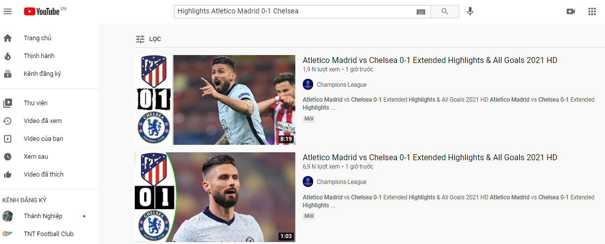 Bước 2: Tìm kiếm cụm từ khoá "Highlights Atletico Madrid 0-1 Chelsea"
