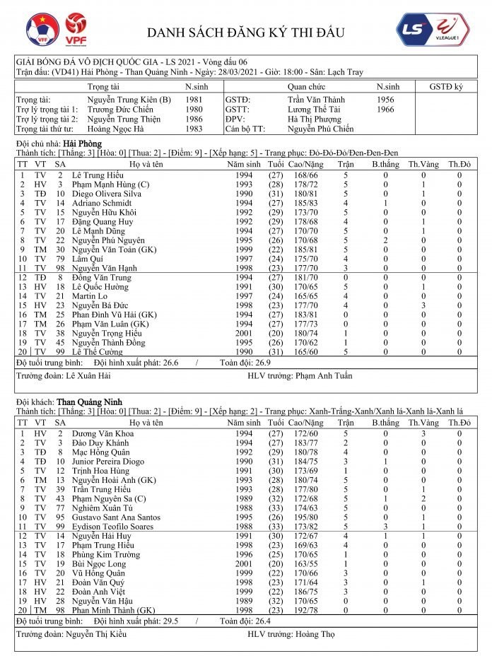 Đội hình thi đấu Hải Phòng vs Than Quảng Ninh